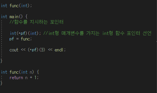 int(*pf)(int); 는 int형 매개변수를 가지는 int형 함수 포인터 pf를 뜻한다.