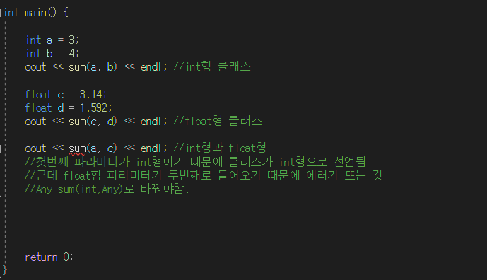 두번째 sum은 매개변수가 두개가 모두 다 float형이기 때문에 float형 클래스가 된다.